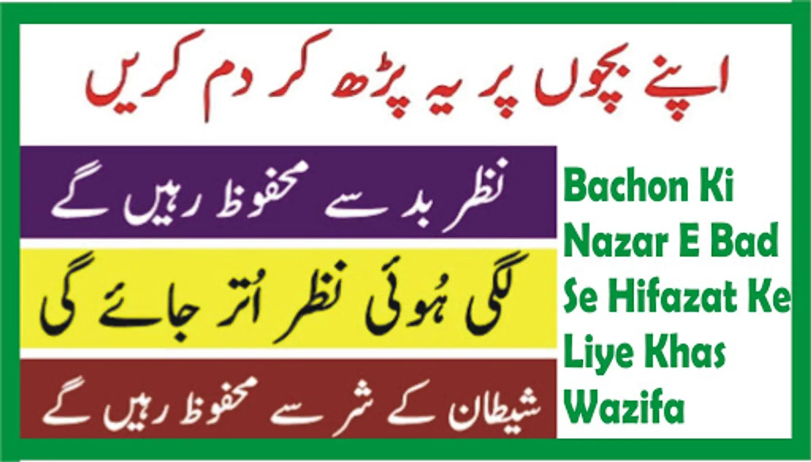 Yeh Bachon Ki Nazar Se Bachne Ki Dua Hi, Aik Khas Wazifa Hai. Iss Amaal se har kisam ki nazar utar jati hai. In shaa Allah Allah Pak Ke Hukam se. Yeah Wazifa Nazar E Bad Boht hi asan hi Parny Mein, Bawazu Karin. Para Hua Water Bachon Ko Pilain.