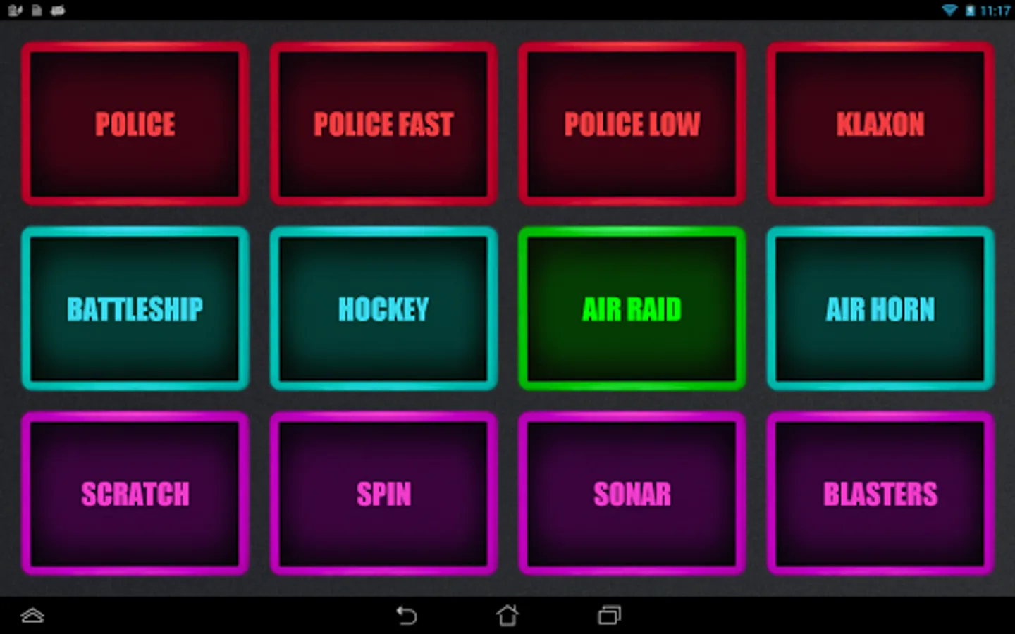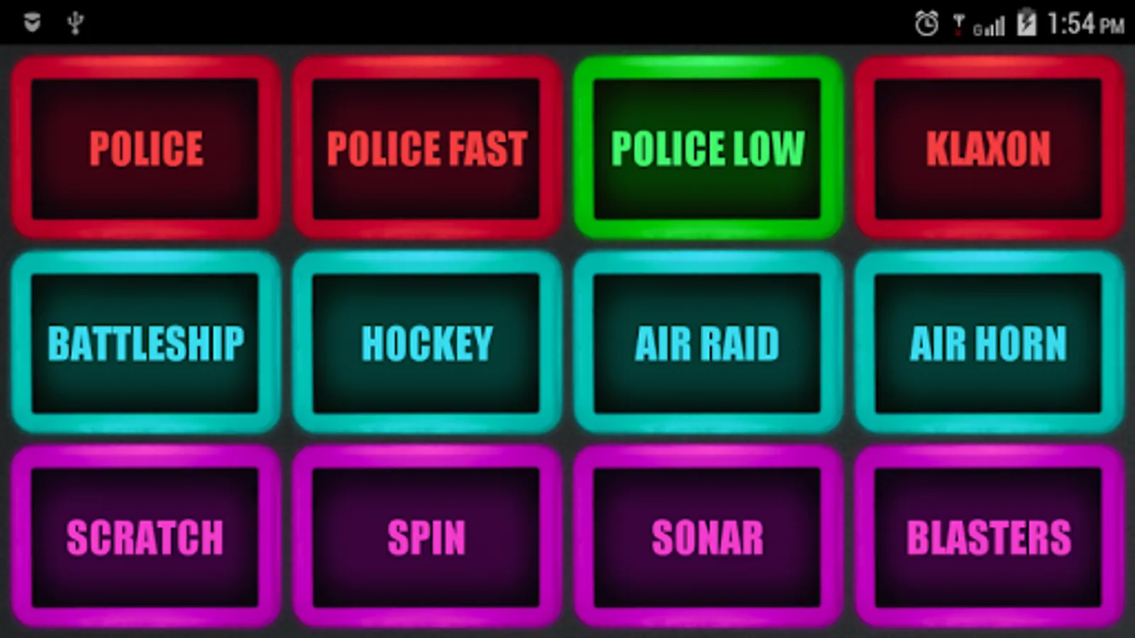There are 12 high-quality lossless sounds (different types of siren: police, alarm, navy, air raid, klaxon, blaster, vinyl scratch, spin, air horn). You can load your own sounds with a single click of a button. Supportable files: wav, flac, mp3, ogg. (Note the duration of audio file is limited to 6-20 seconds and depends on recording format). The button's title will change according to filename. The interface is simple and readable, no useless elements.