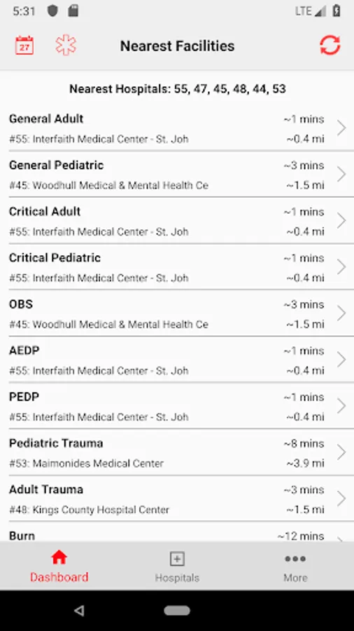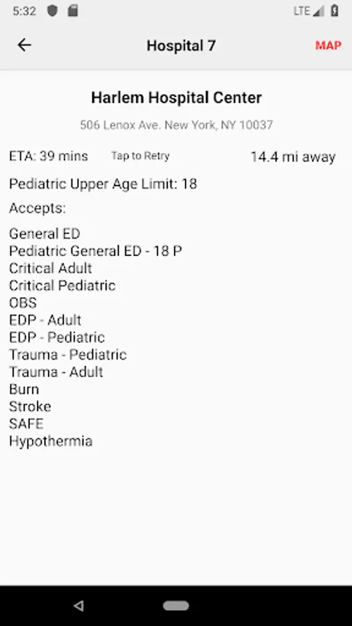 -Hospital info such as address, accepting categories, ETAs, and distance from your current location