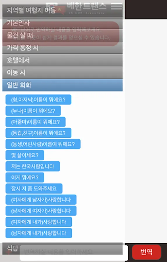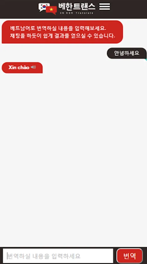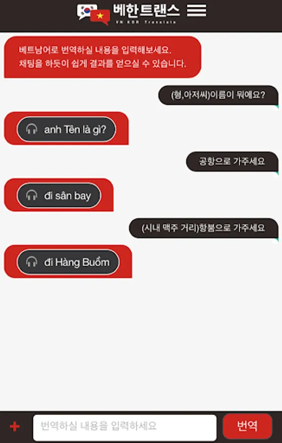 There will be sentences that the translator will not interpret properly. And if you learn Vietnamese conversation with a translator, you may have problems. In Behan Trans, we have collected frequently used sentences. Enter it like a chat, and tap the result button to hear it.