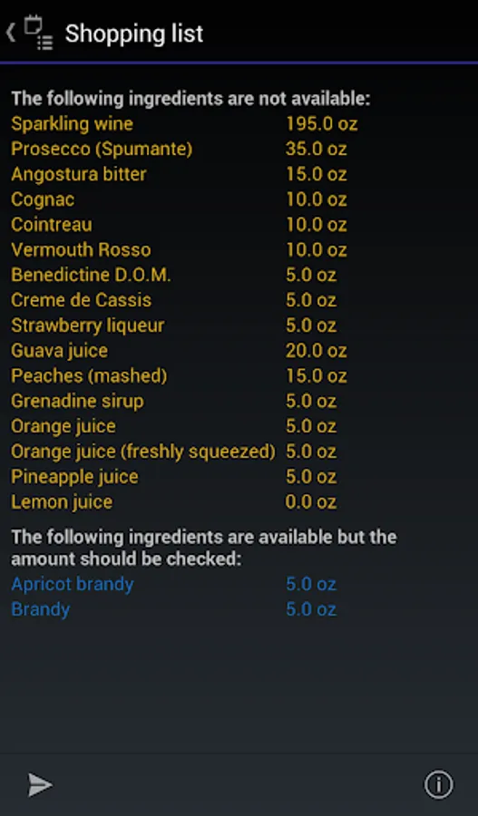 - Automated creation of a shopping list for a recipe collection based on the bar inventory