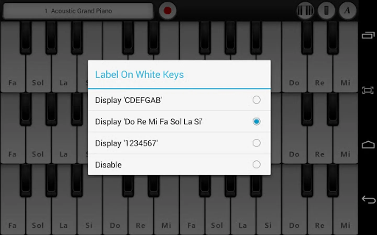 - 4 label options: "CDEFGAB", "Do Re Mi Fa Sol La Si", "1234567" and Disable.