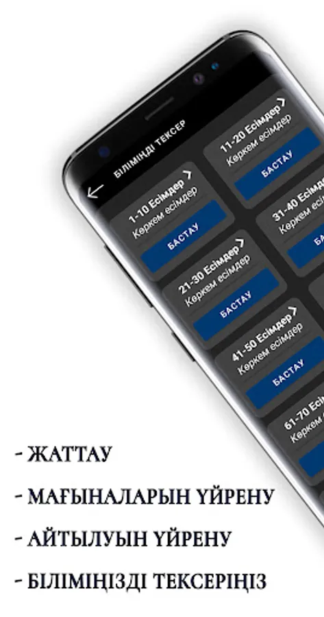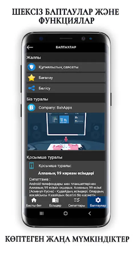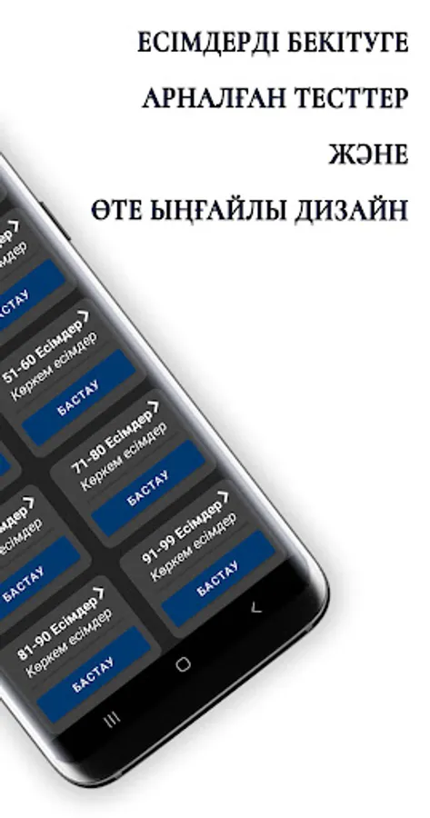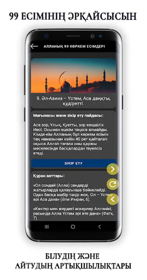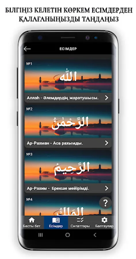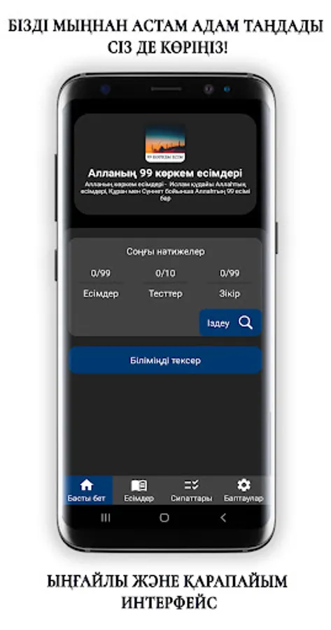 Асмаул Хусна қосымшасының көмегімен Алланың 99 есімін Араб оқуларымен, қысқа мағыналарымен және ұзақ түсіндірмелерімен зерттеуге болады. Сіз кейінірек оқығыңыз келетін Алланың таңдаулы есімдерін қоса аласыз. Мәтіндер ыңғайлы оқуды қамтамасыз ету үшін өлшемі өзгертілетін жоғары контрастты қаріппен көрсетіледі.