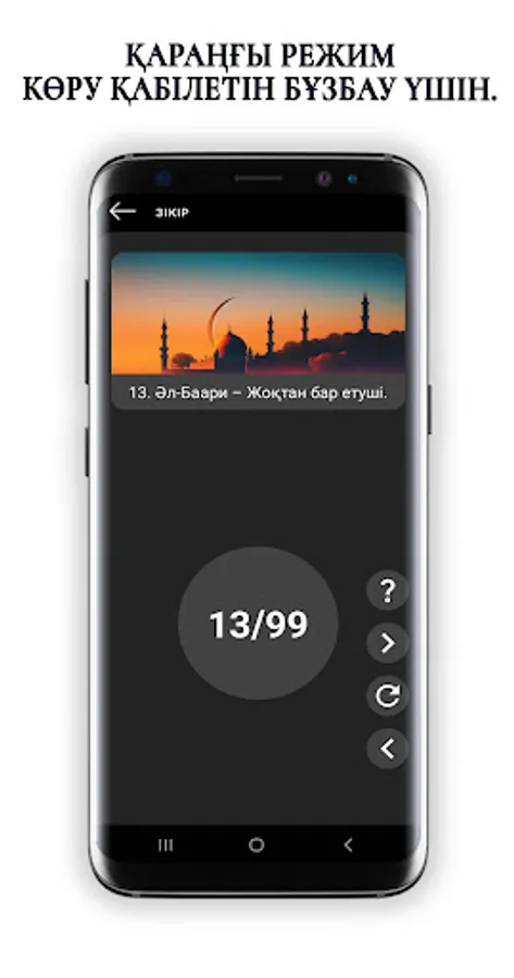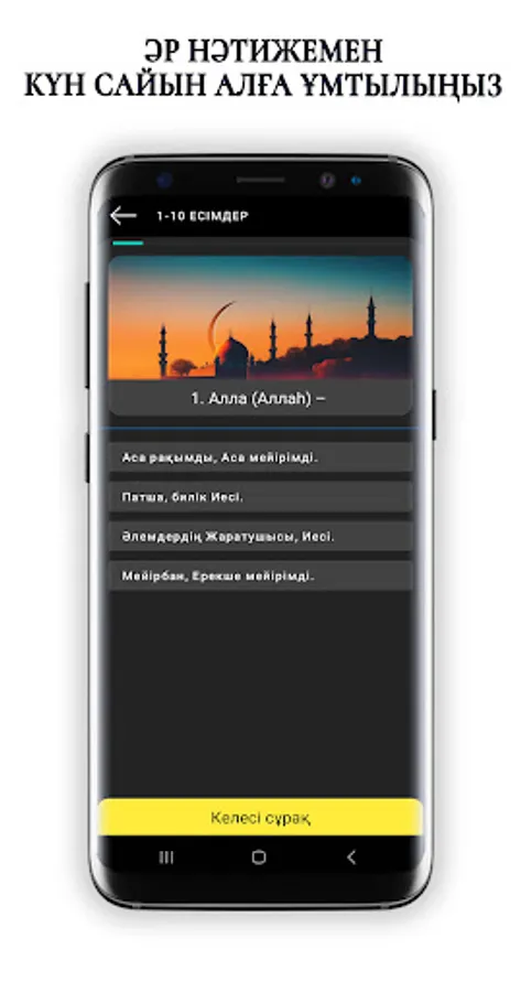 Біз викторинаны ойын форматында жасадық, оның орнына Алланың 99 есімі Асмаул Хусна мағыналарымен кездейсоқ араласады. Сіз әр уақытта "дұрыс" немесе "жалған" деп жауап беруіңіз керек, бір-біріңіздің атыңыз бен мағынаңызды байланыстырыңыз. Осылайша Сіз Алланың 99 есімінің мағынасы мен айтылуын үйреніп, біліміңізді тексере аласыз.