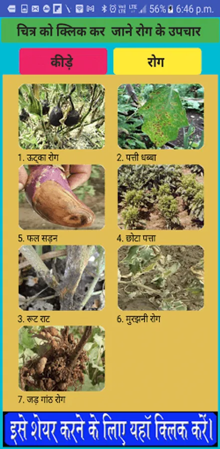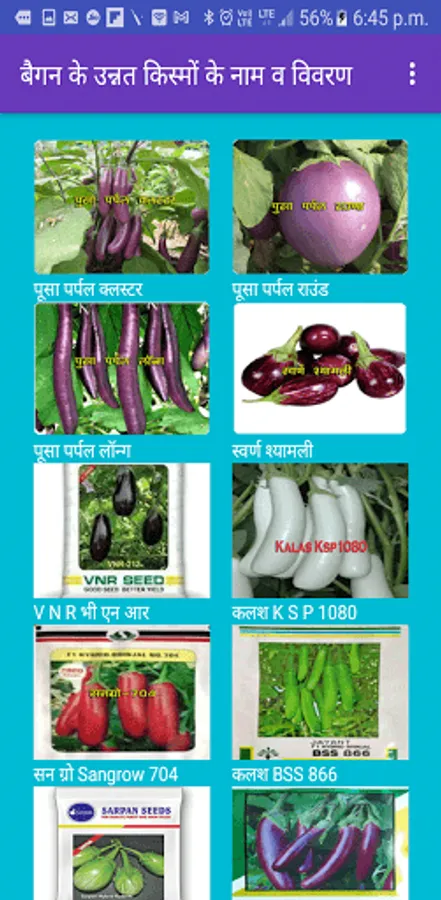 बैगन एक ऐसा फसल है जिसकी खेती सालो भर की जा सकती है / किसान इसकी खेती अगर सही तरीका अपना कर बड़ा मुनाफा कमा सकते हैं / इस app में बैगन की खेती को बारीकी से बताने की कोशिश दी गई है / बैगन की फसल में रोग का प्रकोप किसान की कमर तोड़ देता है कम जानकारी के कारण किसान इस पर पानी की तरह पैसा बहाते हैं फिर भी अच्छी फसल नहीं ले पाते / आपको इस app मे संक्रमित पौधे की तस्वीर के साथ उनके कारण और नियंत्रण के रसायनिक एवं जैविक विधि को दर्शाया गया है / kitchen gardening के लिए जरूरी सामान और स्टेप्स को भी बताया गया है / बैंगन की कई अलग-अलग किस्में होती हैं लेकिन इनके लगाने का तरीका लगभग एक ही जैसा है। अगर आपके घर के किसी कोने में या फिर छत-बालकनी में अच्छी धूप आती है तो आप अपने घर में आसानी से यह सब्ज़ी उगा सकते हैं।