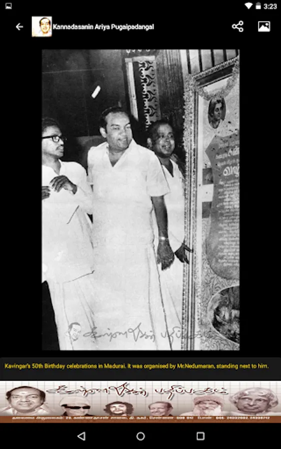 In this photo apps you will see him as a Poet, Lyricist and powerful orator and a very friendly person. In all these Rare photos you will see the entire dignitaries of the Tamil Cinema and literature had the privilege of being with him and photographed with him.