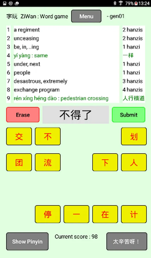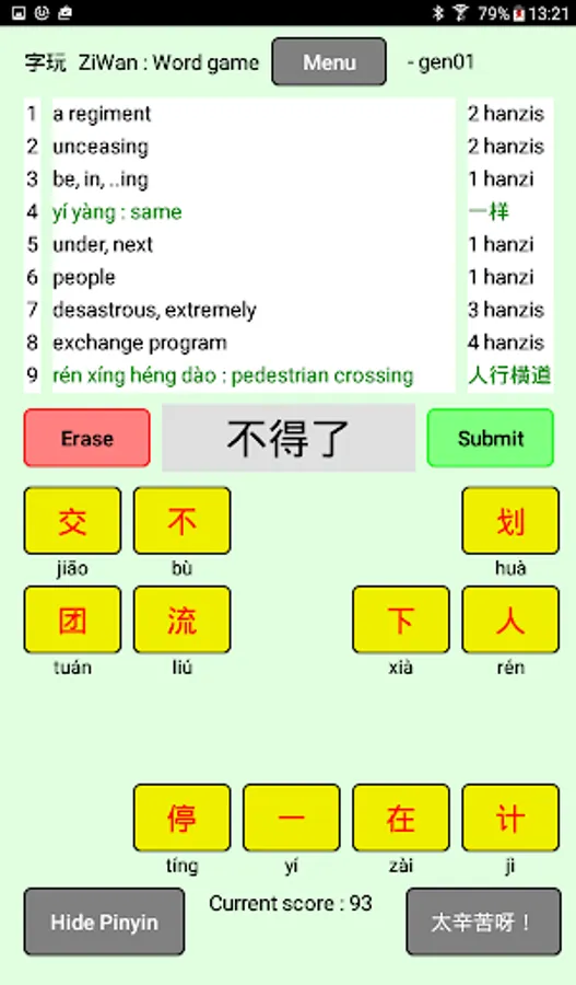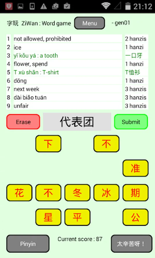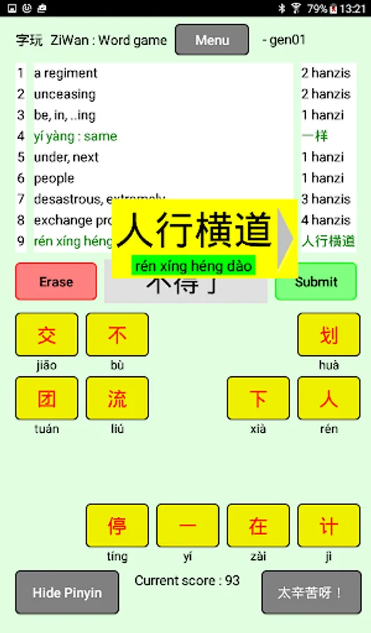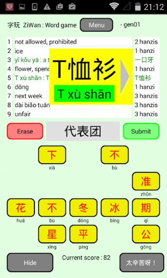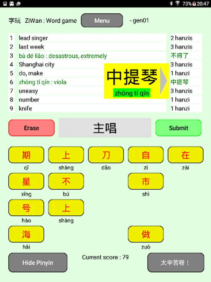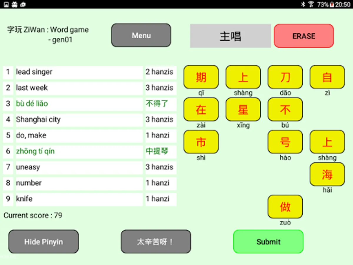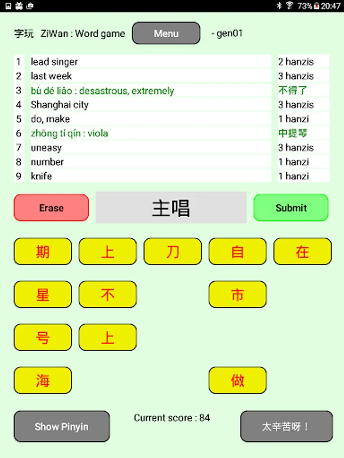 In this educative game you must find Chinese words composed from 1 to 4 hanzis. Each panel features 9 definitions and 20 hanzis. A score show the progression of learning. Several different levels and themes are available.