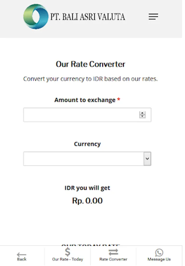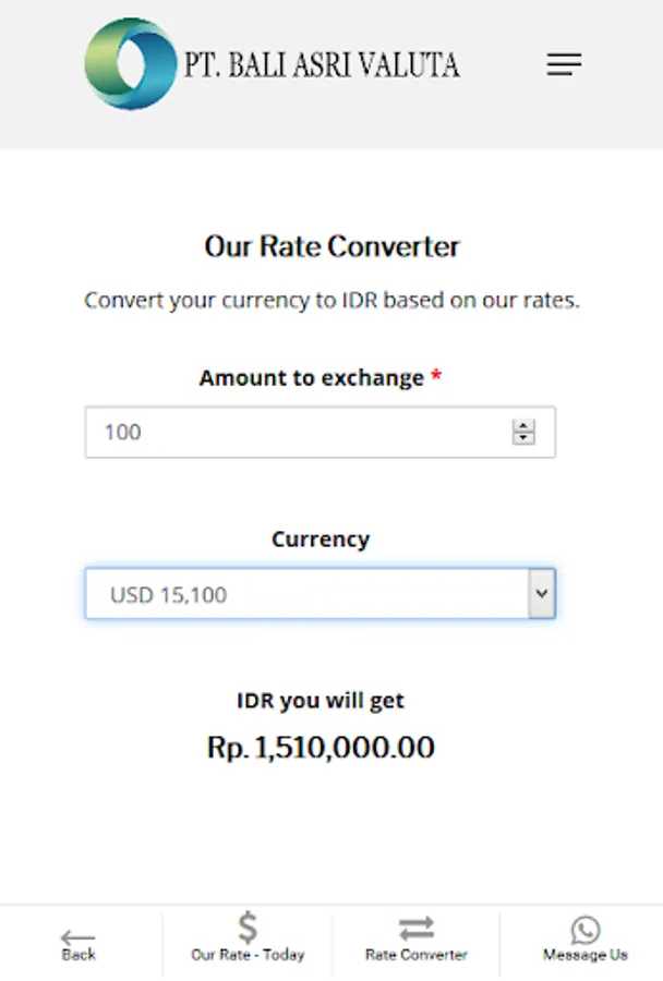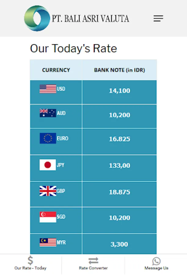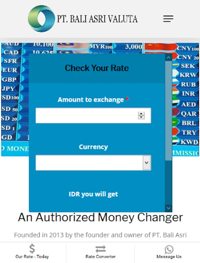 A tool to convert currencies to Indonesian Rupiah (IDR). This tool is provided by PT. Bali Asri Valuta, an Authorized Money Changer in Bali as a service for those who need to do exchange rates. The rate valid for PT. Bali Asri Valuta outlets only.
