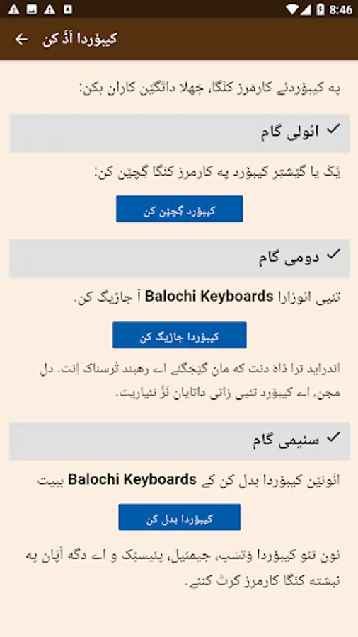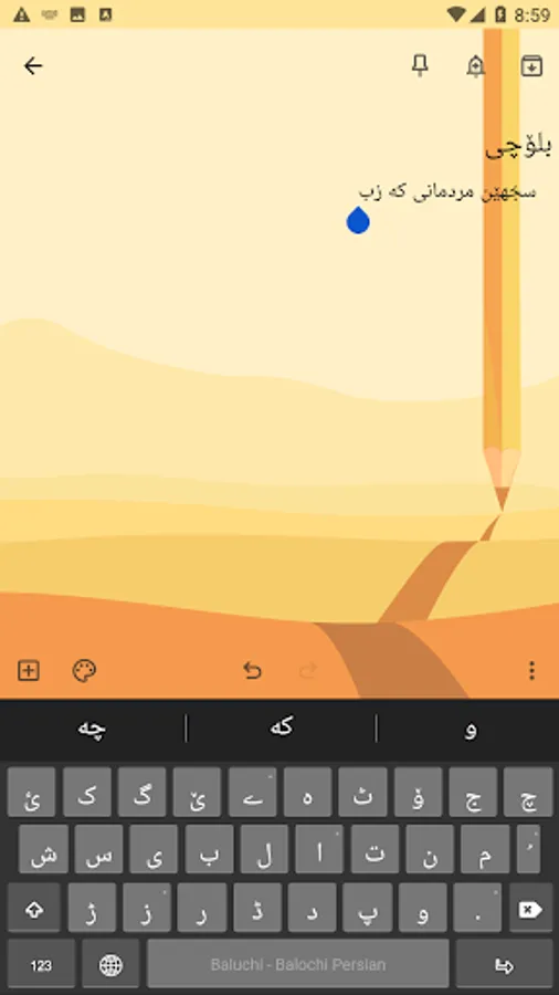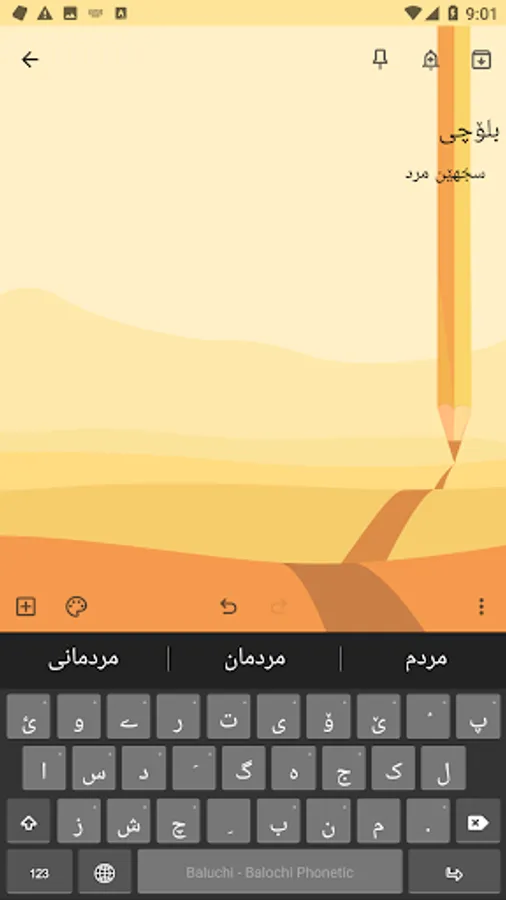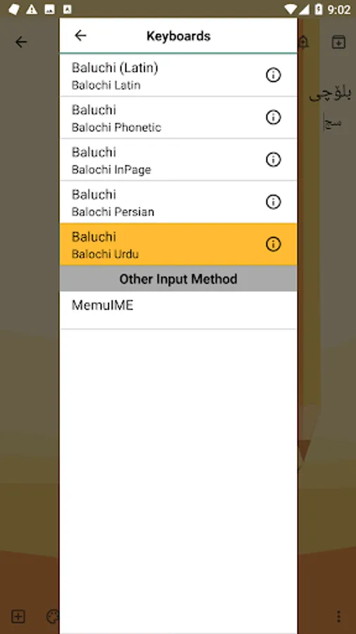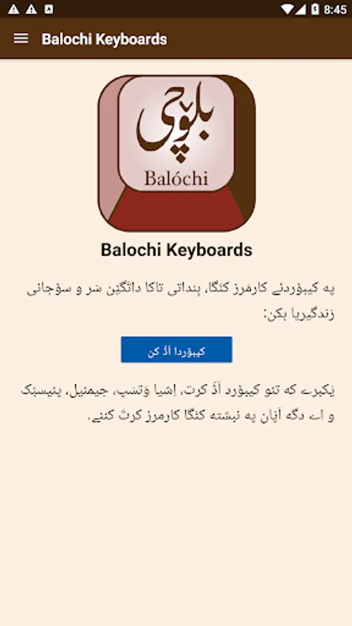 This app gives you four Arabic script Balochi keyboards and one Latin script Balochi keyboard. Whether you are used to a Persian, Urdu, InPage or Western keyboard layout, this keyboard is the solution. Turn on the keyboard layouts you like best and start using it in all your apps.