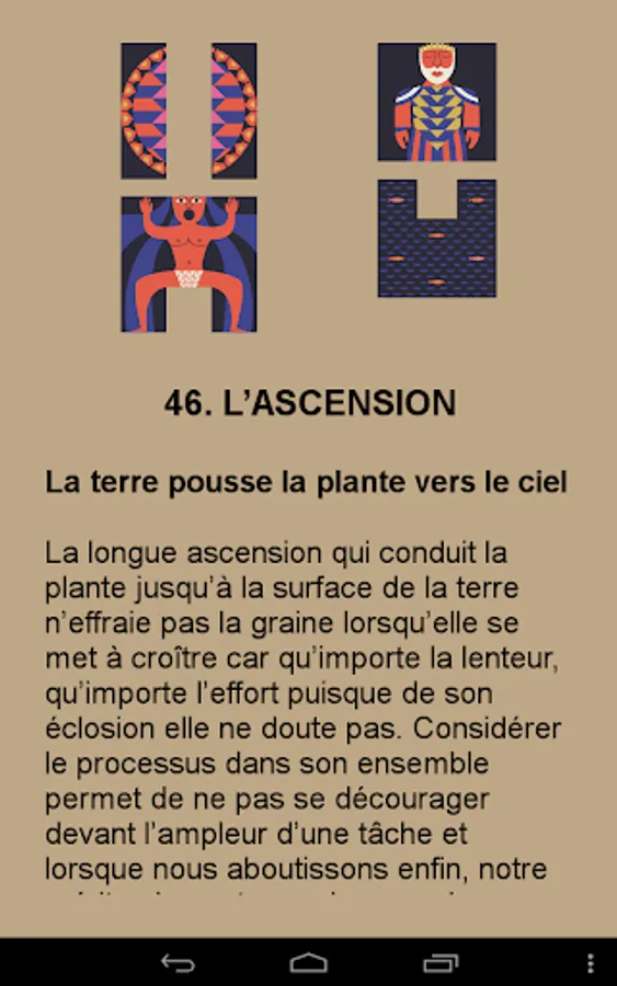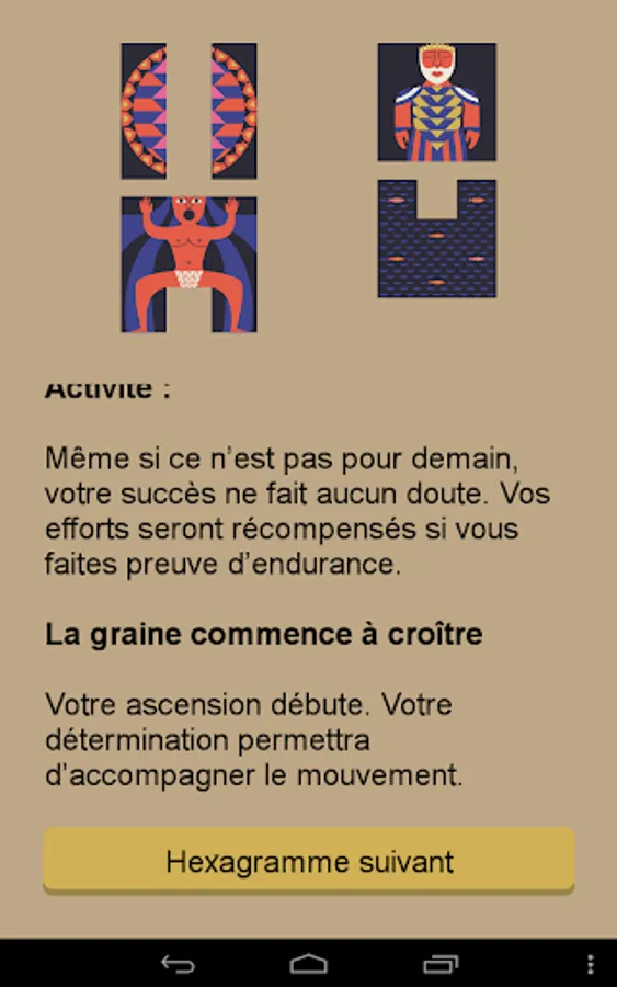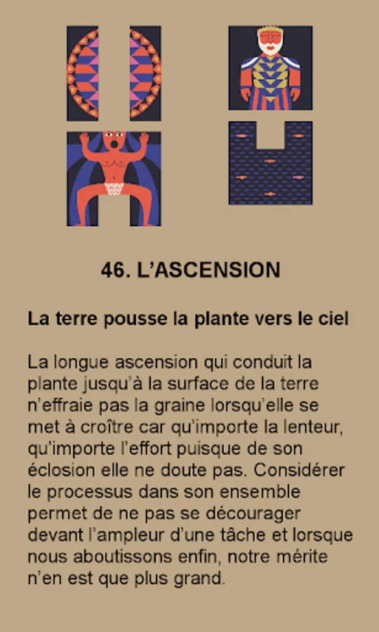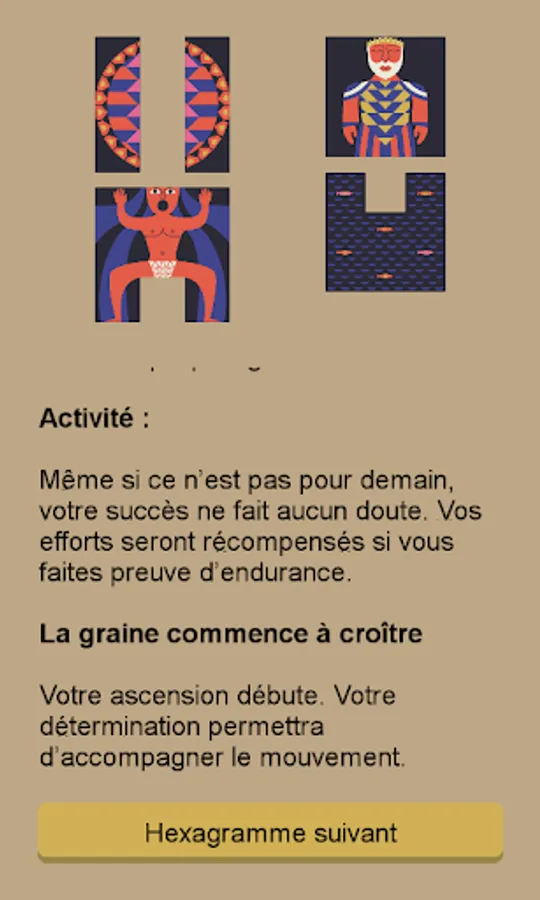 Each print includes one or two of the 64 hexagrams that make up the game. Each of them is a lesson of wisdom and allows you to get in touch with your intuition. Then, if you get two figures, you access one of six movements attached to each hexagram. These movements indicate whether this is the right time to act or not.
