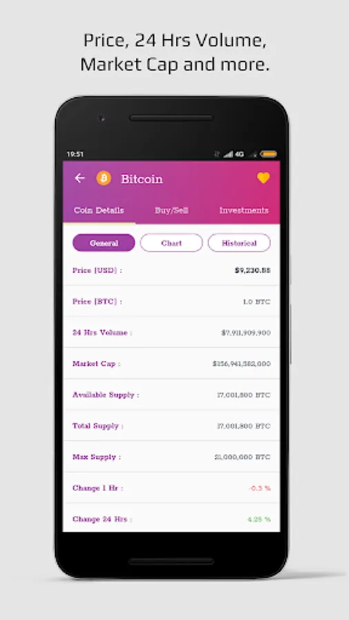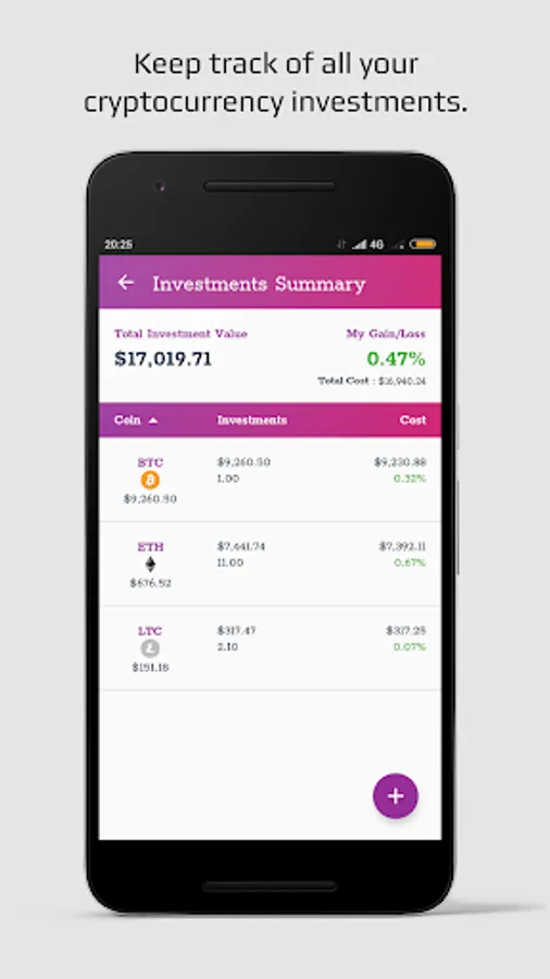 * An easy portfolio feature to keep track of all your Cryptocurrency investments.