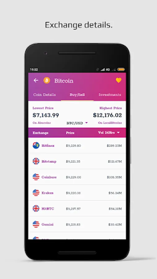 * Information on where to Buy/Sell Crypto currencies. Exchanges details with option to navigate to their official websites from the app itself.