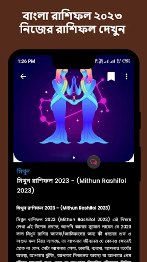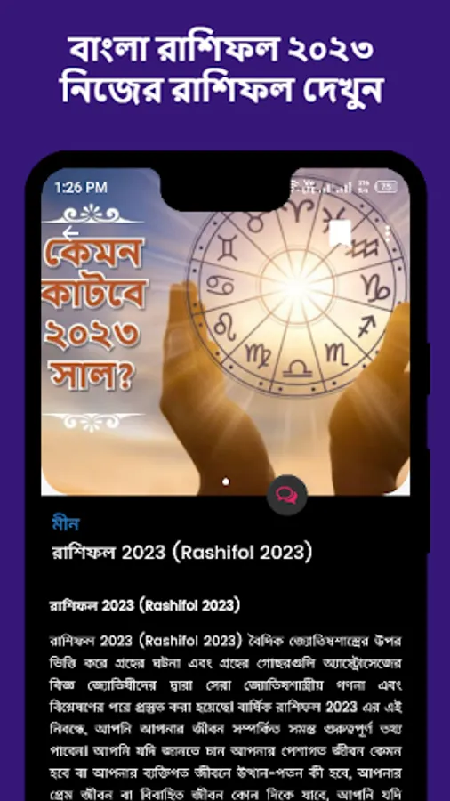 Bangla Rashifal 2023 with daily horoscope or Bengali Rashifal is an Astrology app that brings you Bangla Daily Horoscope, daily Rashifal forecast or predictions, Yearly Rashifal, daily and monthly calendars with panjika in the Bengali language. This app shows Bangla Calendar monthly calendar as per the Bengali month calculation. This Astrology app can be used by Bengali people across the world as a daily reference. This app helps in determining good times, bad times, good days, etc. These Bangla astrological predictions are prepared by qualified famous astrologers providing professional service in West Bengal. This daily reference app helps in providing useful information for the day along with Rashifal.