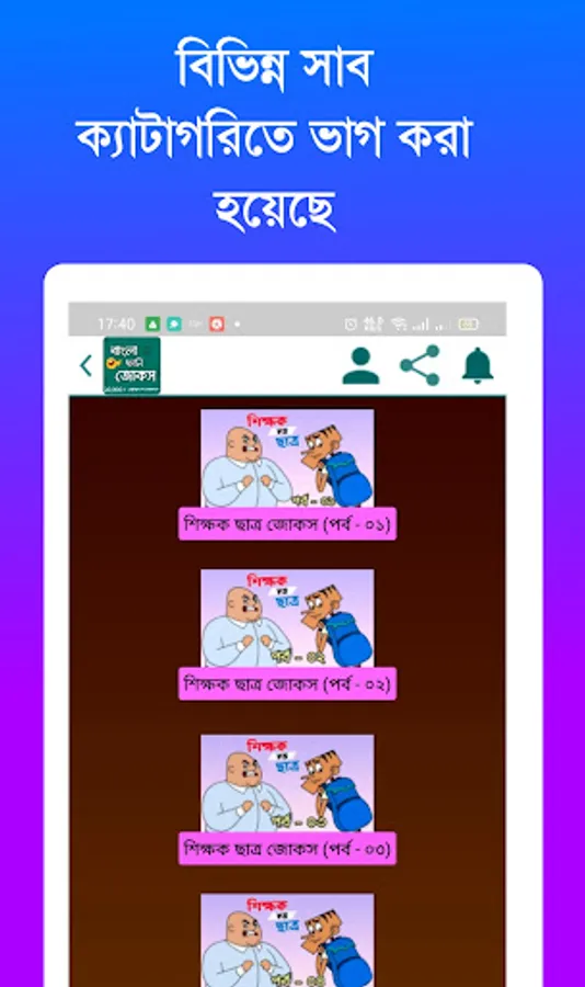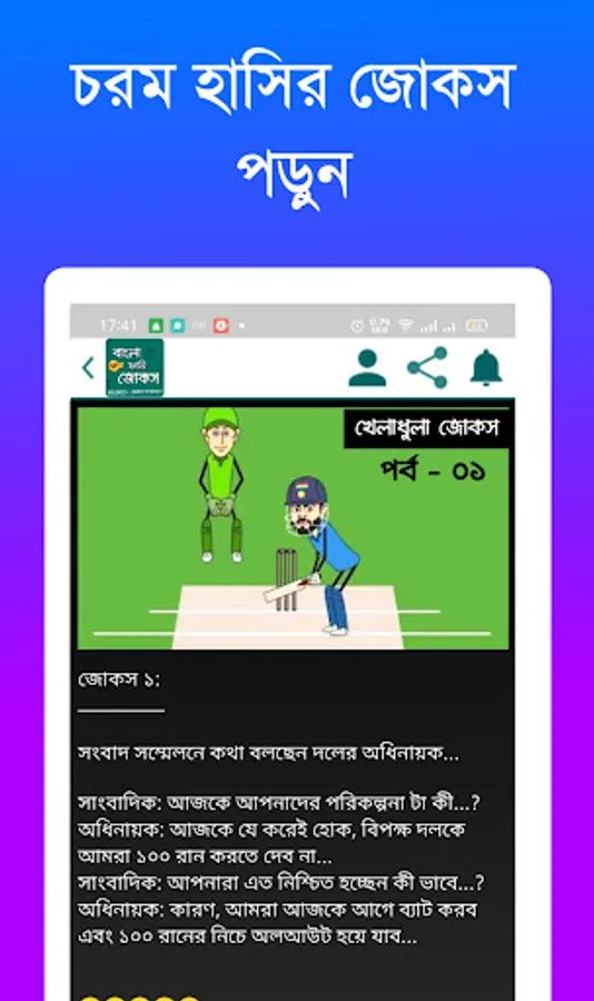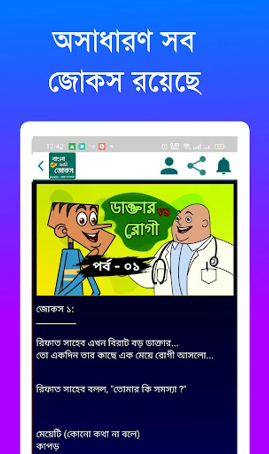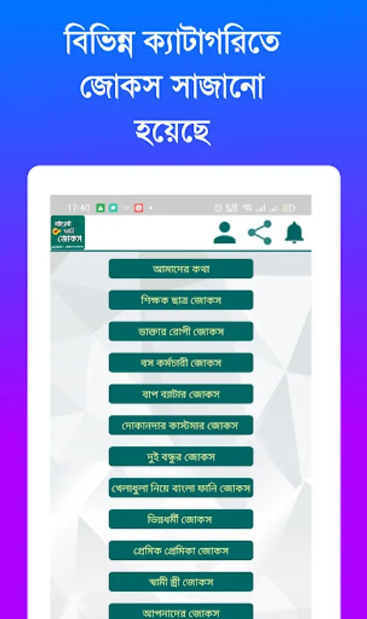 Bangla funny jokes app is a Bangla jokes collection and you will find many Bangla funny jokes and Bangla hasir jokes in our app . This Bangla jokes are very funny and laughing jokes . There is boltu jokes, doctor patient jokes, dukandar customer Bangla funny jokes and also many jokes which are Bangla funny jokes . If you will a jokes love her then this Bangla funny jokes app is for you . This Bangla funny jokes can make you laugh and funny . We hope our Bangla funny jokes app is very helpful to you .