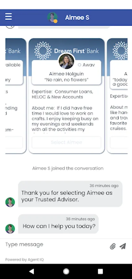 Chatter by Dream First Bank provides you with secure, mobile connectivity to your very own Dream First banker. Through our app, you get to pick an Advisor that’s right for you. Choose someone who shares your hobby, lives in your hometown, or roots for your favorite sports team. We can’t promise the choice will be easy, but the choice is all yours.