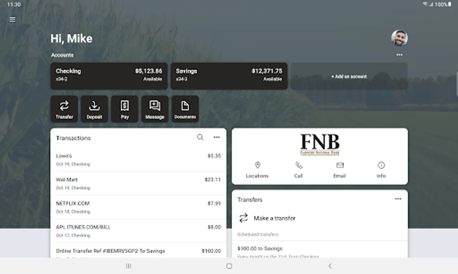 To use the myfarmersnationalbank app, you must be enrolled as a Farmers National Bank digital banking user. If you currently use our Internet Banking, simply download the app, launch it, and login with the same Internet Banking credentials.