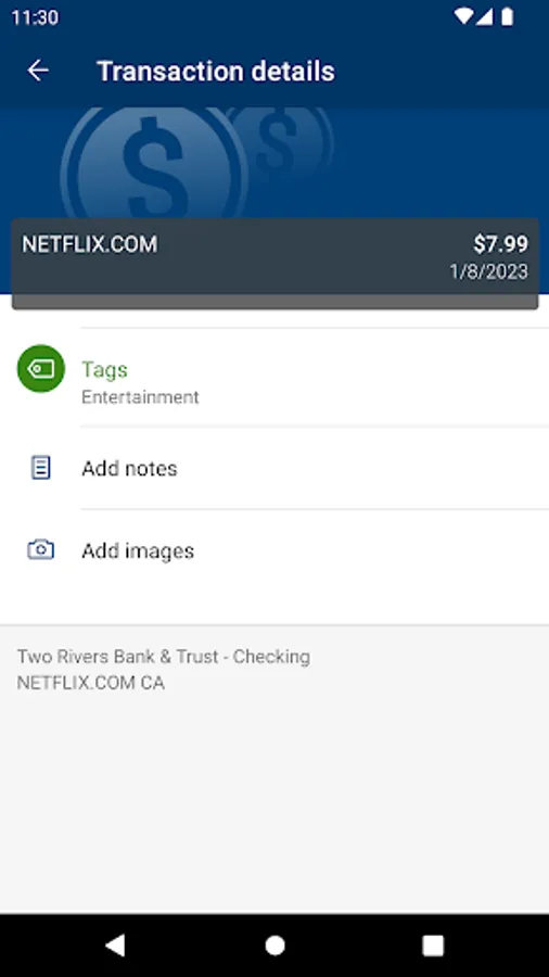 · Keep your transactions organized by allowing you to add tags, notes and photos of receipts and checks.