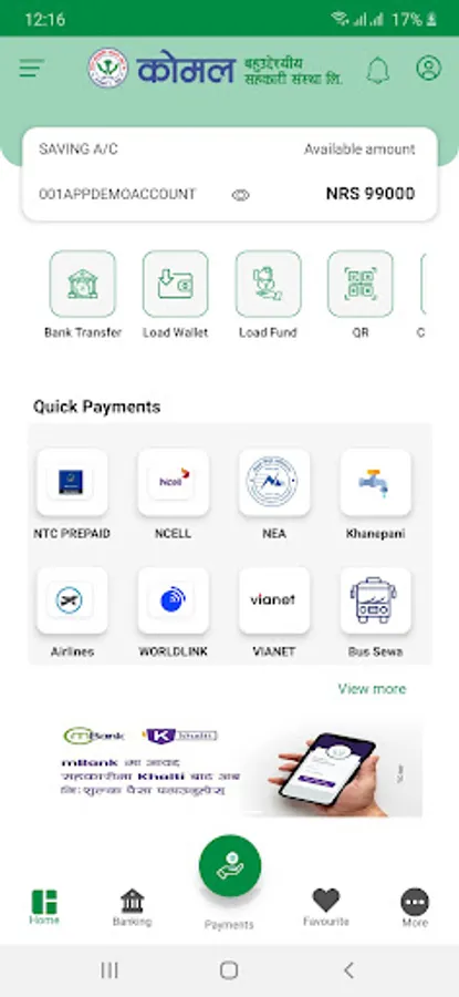 Komal Mobile App provides different banking solution as well as facilitating utility payment and mobile recharge/ topup for different telecom service provider like Nepal telecom, Ncell, CDMA for the account holders of Komal Multipurpose Co-operative Limited.