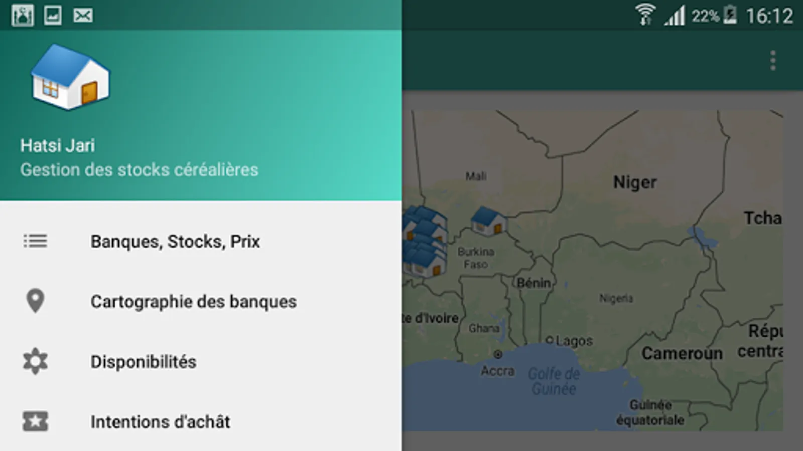 In order to improve the availability of primary cereals products in Africa, the application hatsi Jari adds to the grain banks in order to bring a better management of their stocks as well as the opening to the world market. Geolocation banks, price intelligence, find out all the information you need to carry out your operations (purchases and sales) in the agricultural market in africa.