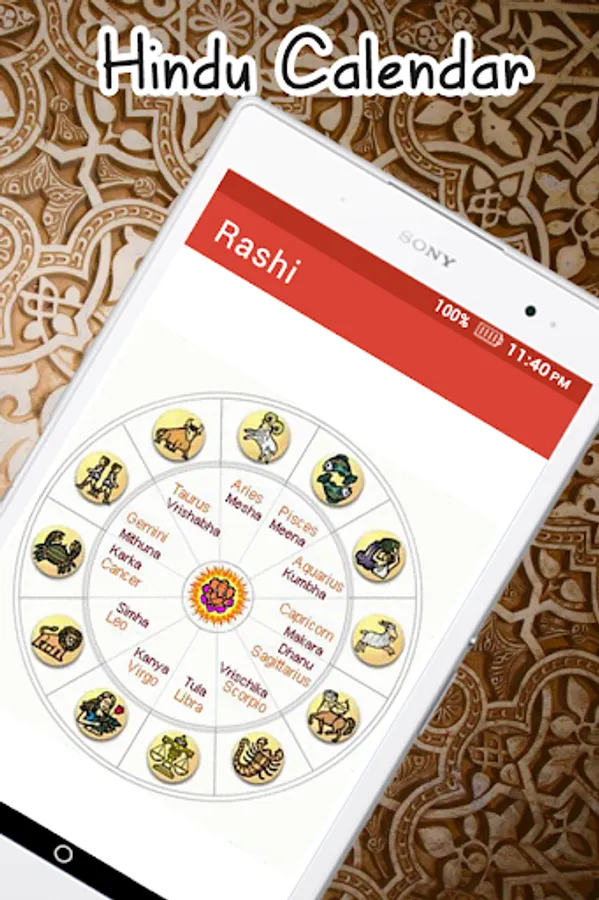 Also shows varsh (Year), maah (month purnimant and amavasyant), zodiac of moon, ayana (Dakshinayan and Uttarayan) and the ritu (Season), along with their end times.