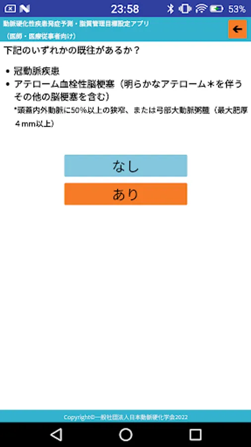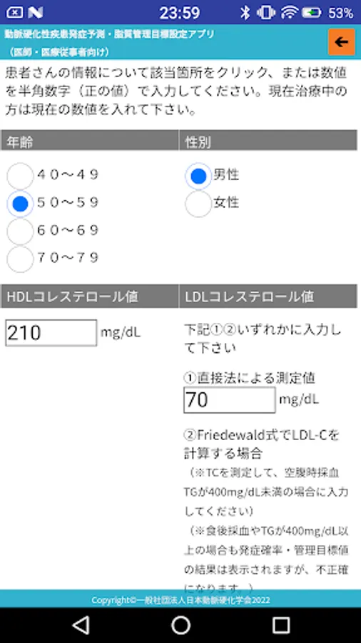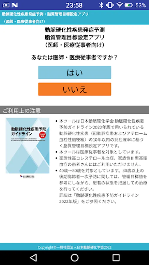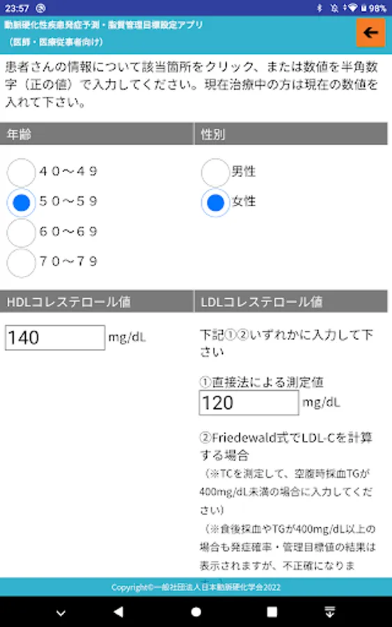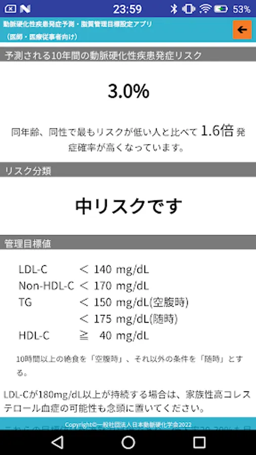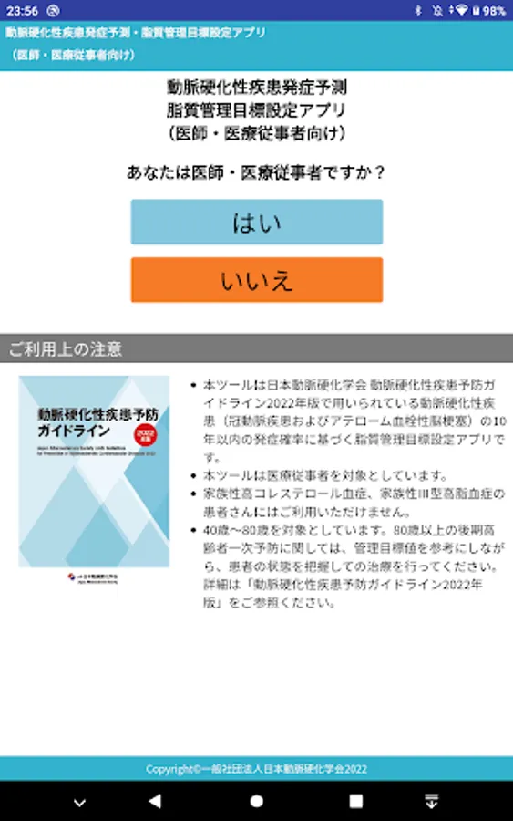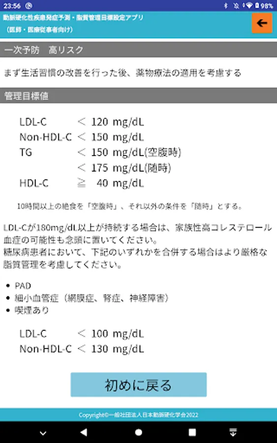 ・ This app is a lipid management target setting app based on the onset probability of arteriosclerosis (coronary artery disease and atherosclerotic cerebral infarction) used in the 2022 edition of the Japan Atherosclerosis Society Arteriosclerosis Prevention Guidelines within 10 years. ..