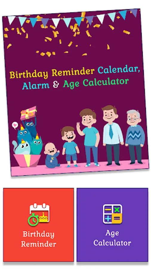 Birthday Reminder, Calendar, Alarm and Age Calc is birthday reminder app for android in which you can easily edit photo, name and date of birth and set birthday alarm to remind his or her special day at exact right moment. If you decide whether you want to get a notification before some day and get a notification on the same day itself with birthday reminder with alarm, birthday reminder calendar, birthday event reminder, birthday and event reminder, birthday reminder with notification app.