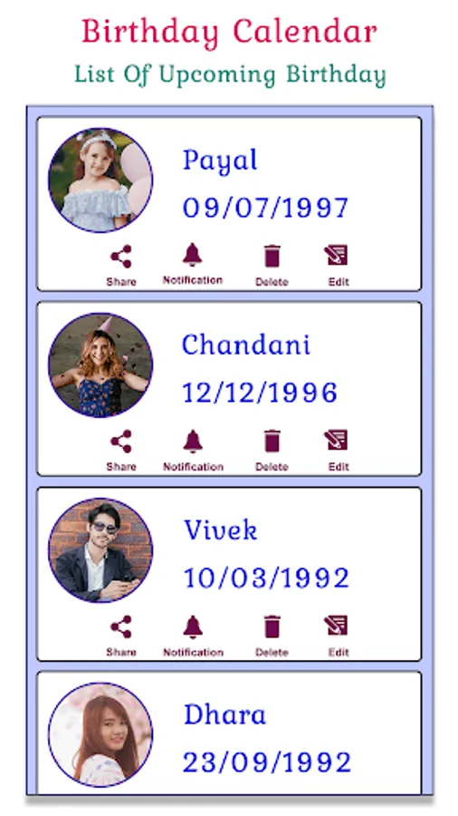 Birthday calendar easily add photo, name and birthday date easily and fast and create your personal upcoming birthday dates reminder calendar with this birthday event reminder app.