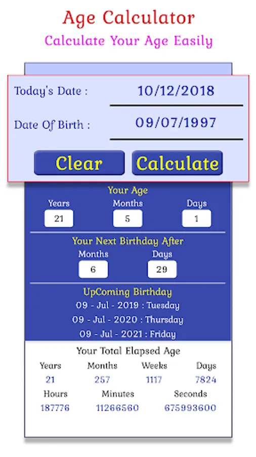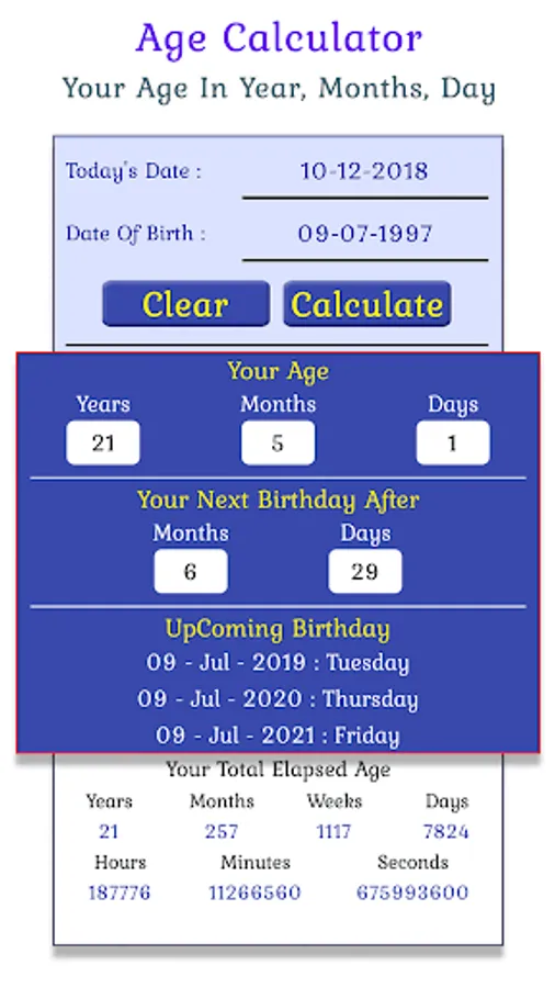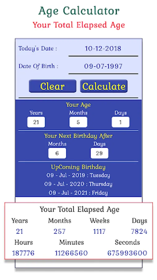 Just enter your date of birth and get your total elapsed age in years, months, weeks, days, hours, minutes and seconds. also display your upcoming next three birthday with exact date and day. So, this Age Calculator app is very useful to find upcoming birthdate and calculating perfect age at a time.