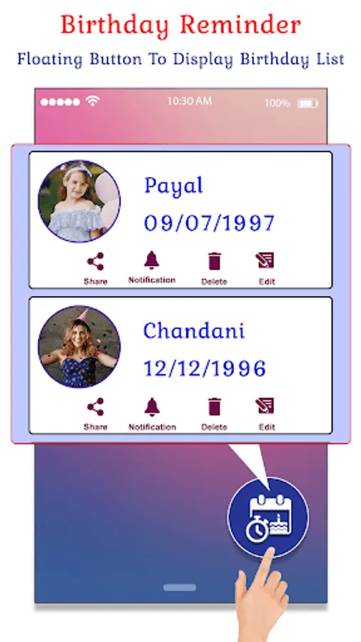Personal birthday list floating button available on your screen every time and any where, press on birthday list floating button and view upcoming birthday and send birthday cards with wishes and say happy birthday to you.