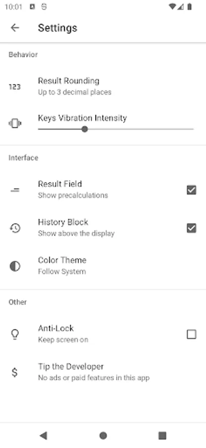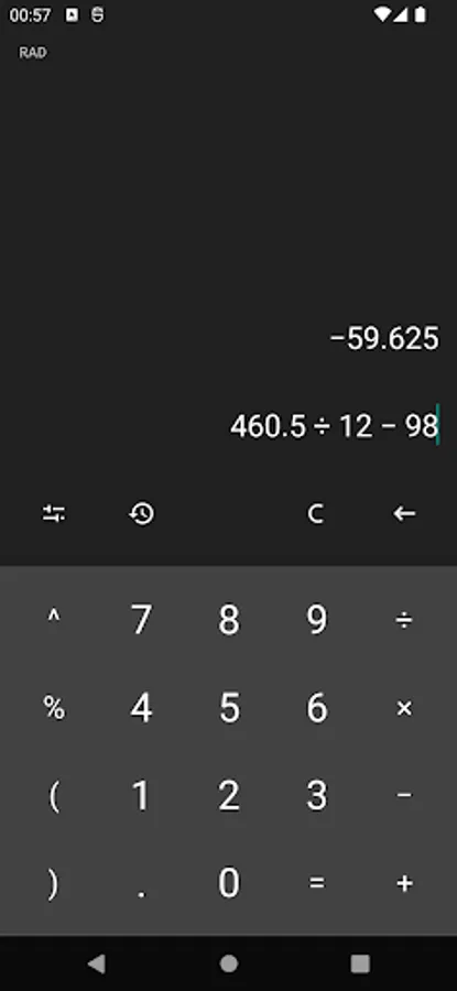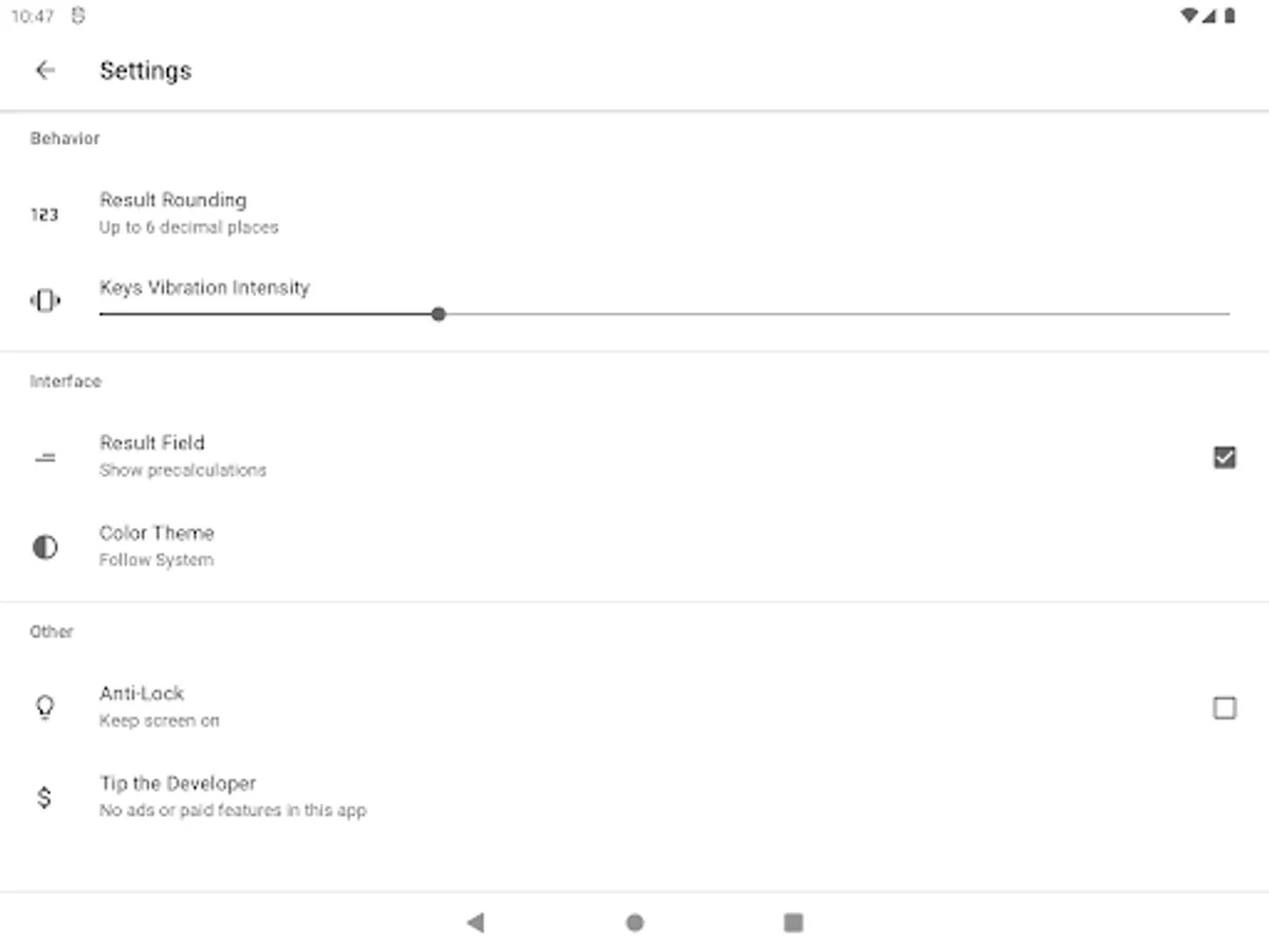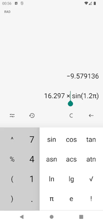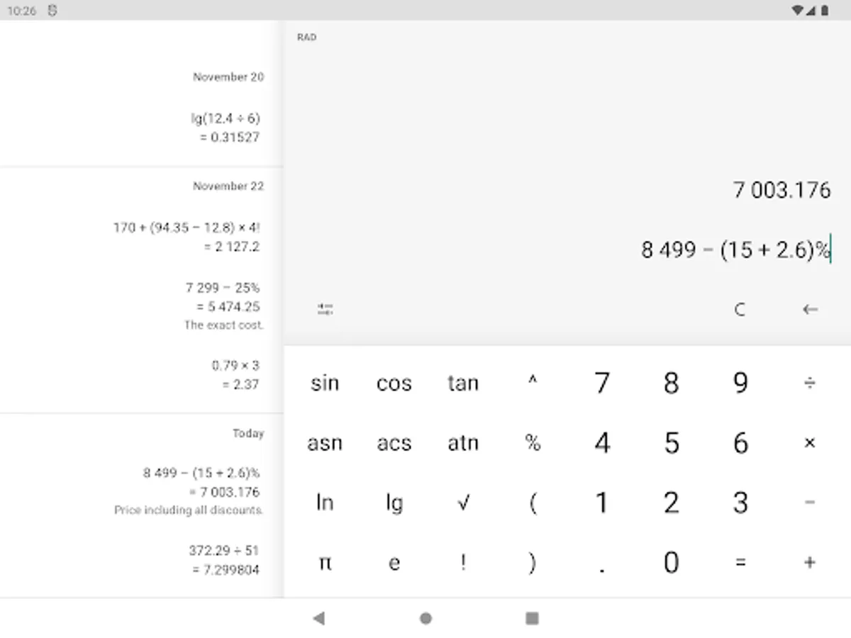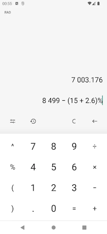 Calculator with percentages, powers and functions. History with comments. Cursor for editing anywhere. Simple interface with dark and light themes.