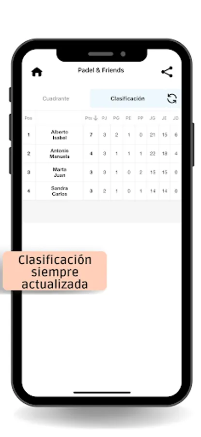Beyond organizing and tracking matches, Padel Share prides itself on its detailed ranking updated in real-time. With it, you can consult a broad range of statistics, from points and games won to matches tied and lost, and game difference. These metrics provide deep insight into each player's achievements and performances, elevating your tournament experience to an entirely new level.