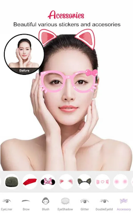 With many cosmetic tools to beautify the face and skin make all your photos even better! Try stickers, frames, filters, accessories and collages, add stickers; or do a single tap quick photo touch up, use the blur tool or choose from many other special effects.