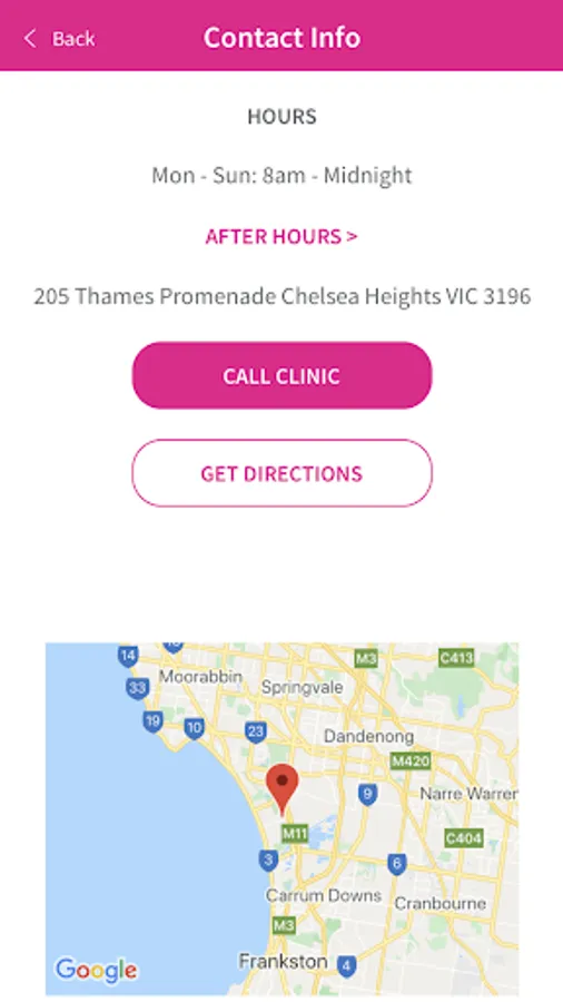 Allows you to Book an Appointment, Contact the Medical Centre easily, get directions to the Clinic, view Practice Info, After Hours Care details and Practice Services, all from your Mobile Device