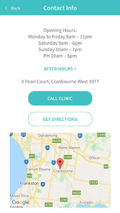 Allows you to Book an Appointment, Contact the Medical Centre easily, get directions to the Clinic, view Practice Info, After Hours Care details and Practice Services, all from your Mobile Device