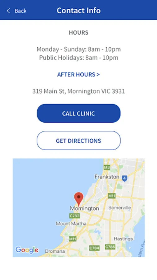 Allows you to Book an Appointment, Contact the Medical Centre easily, get directions to the Clinic, view Practice Info, After Hours Care details and Practice Services, all from your Mobile Device