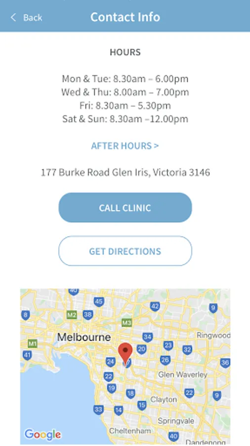 Allows you to Book an Appointment, Contact the Medical Centre easily, get directions to the Clinic, view Practice Info, After Hours Care details and Practice Services, all from your Mobile Device