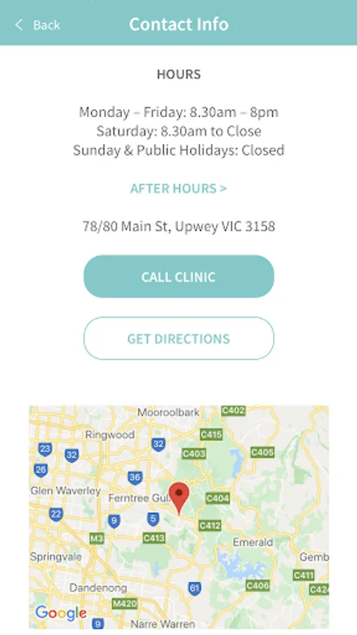 Allows you to Book an Appointment, Contact the Medical Centre easily, get directions to the Clinic, view Practice Info, After Hours Care details and Practice Services, all from your Mobile Device