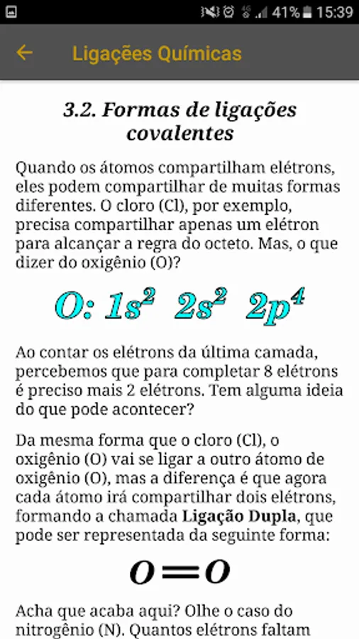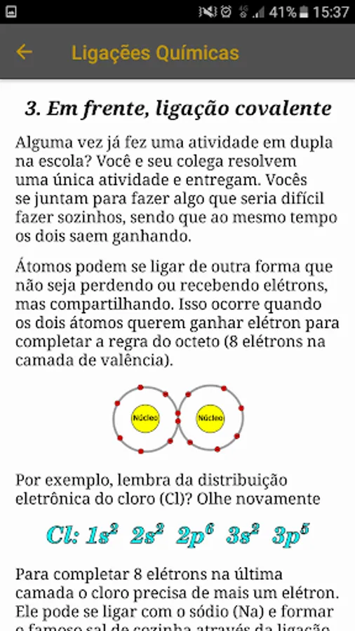 Olá caríssimo, this app is an auxiliary material, or summary, of chemical bonds to basic education. My goal here is to maybe help your study chemistry or even motivate you to discover new things about this science. Between us, I am not the person you love most matter, much less one that dominates perfectly all but left me the challenge of developing something about it and here I am.