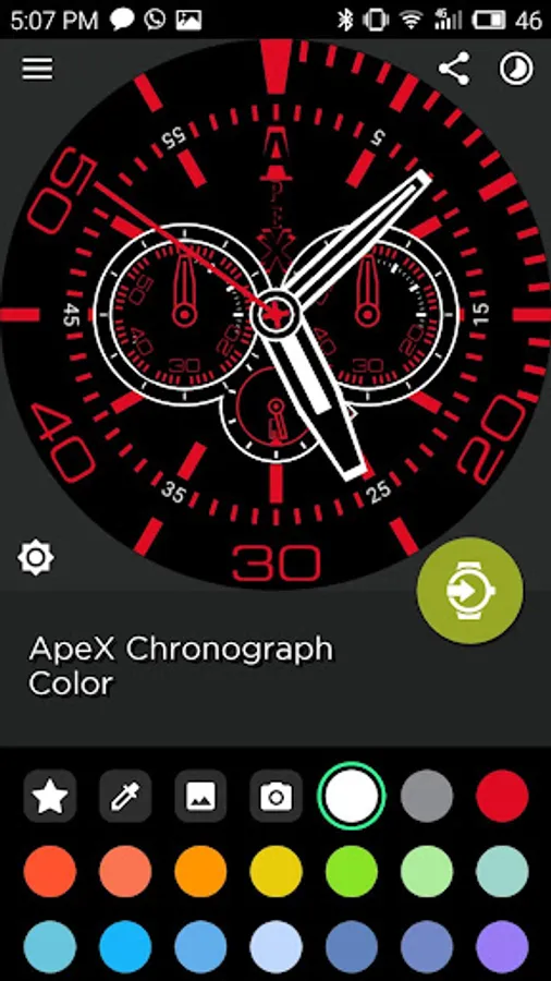 Tap the "A" of ApeX logo to choose color, then asign it on the two color blocks by taping on the "30" or the center of the watch for whatch hands.