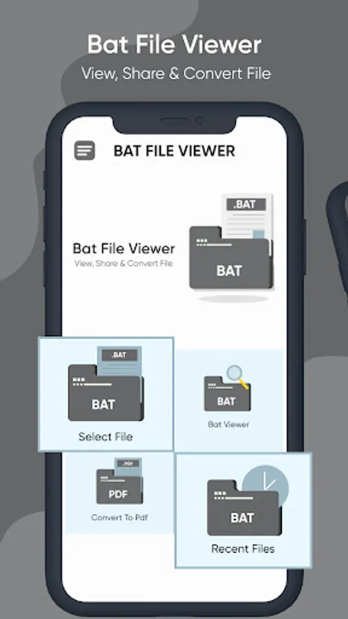 1. The interface of BAT opener app includes four main features; select file, BAT viewer, convert to pdf, and recent files.