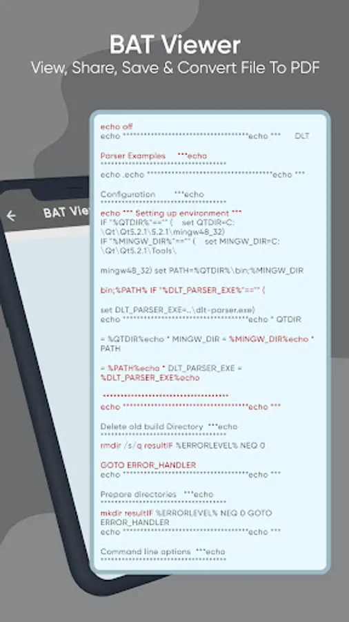 The BAT file opener app allows the user to open, view, and read BAT files. Using BAT file viewer, one can easily open BAT files in their smartphone. Likewise, the user can conveniently share already saved BAT files with just a click. Furthermore, the BAT file opener & viewer permits the user to convert the stored BAT files into PDF smoothly. This BAT file runner lets the user browse files directly from the app using the pick file feature.