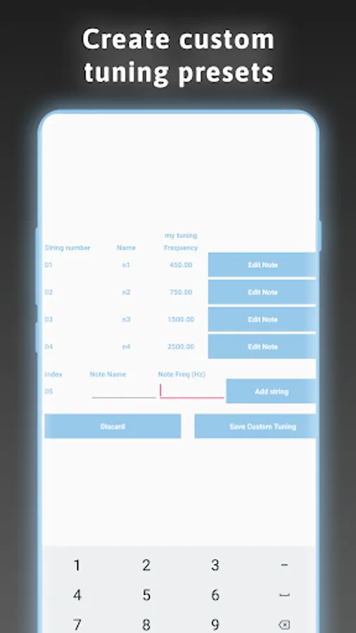 - Even you can create your own custom tuning presets. Up to 7 strings: you can edit the frequencies and names