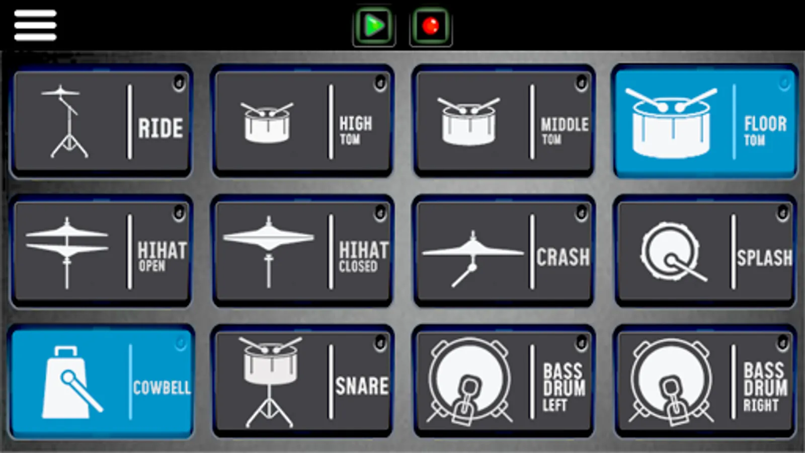 - Pads includes sounds for next instruments: double bass drum (left and right), ride, 3 toms (high, medium and floor), hihat (open and closed), crash, splash, cowbell and snare.