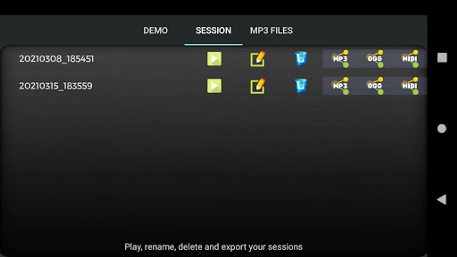 - Export your sessions to MIDI, OGG and MP3 and share your tracks with your friends
