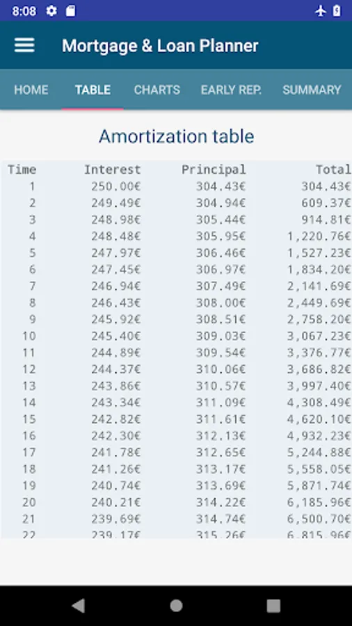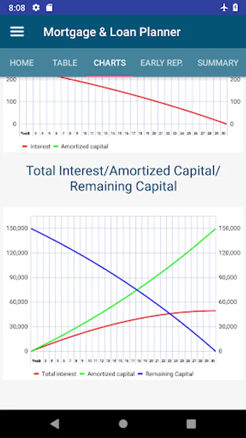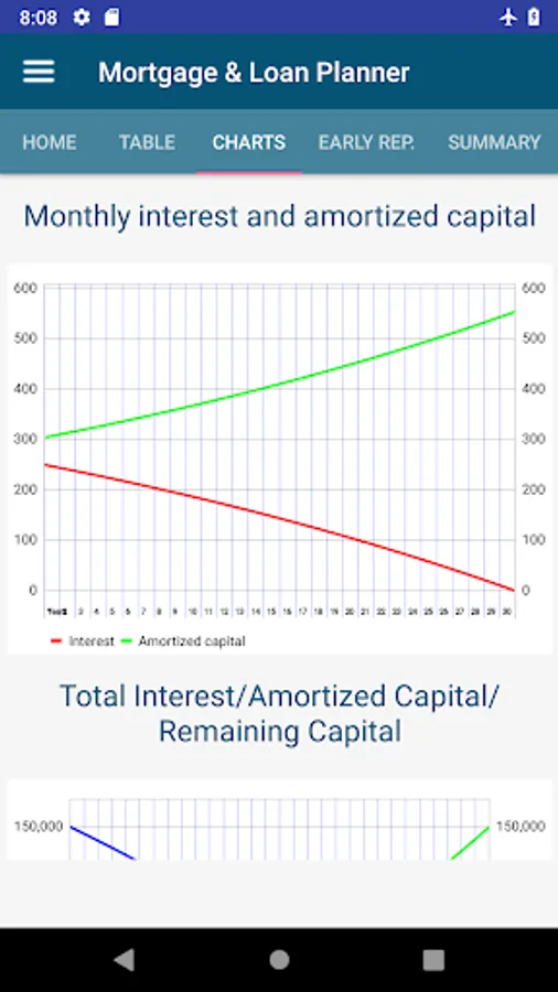 - Fully interactive charts to analyze the evolution of the capital and monthly interest, as well as total interest, remaining balance and total amortized capital each month. You can click on a specific month and detailed information will be shown. You can also zoom or pinch in/out for each specific period.
