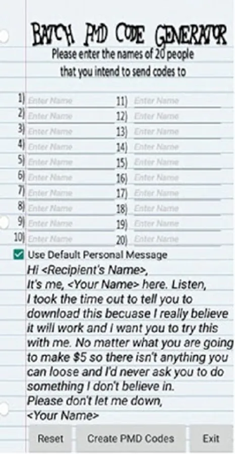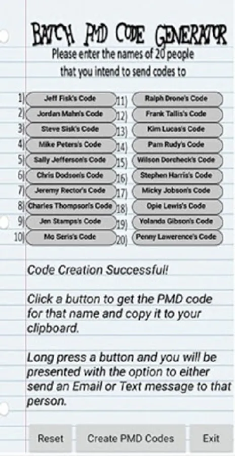 This app allows its users to quickly create 20 personalized PMD Codes at a time and in addition to that, it also allows the user to text or email the people they have created codes for and automatically creates the outgoing message, which includes inputting the corresponding codes for that person automatically in the body of the message.