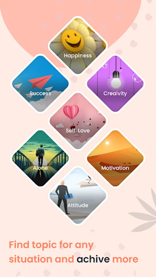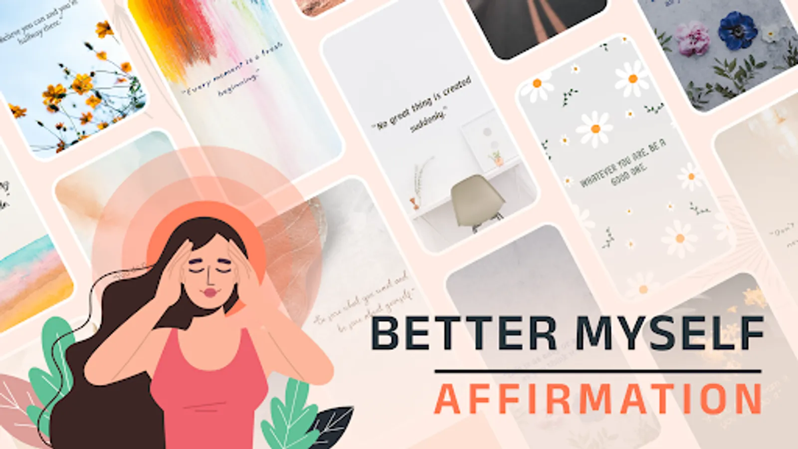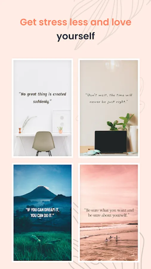 Better myself - Affirmations application gives different categories of daily affirmation quotes like Self care, Self-love, Self-confidence, Gratitude, Fitness, Health, Happiness, Depression, Career, Spiritual, Parents, Kids, Better mornings, Better sleep, Overcoming adversity, Intimacy, Positive energy, Creativity, Mantra, Meditation, Motivational, Healing, Pregnancy, Inspiring questions, gods and more.