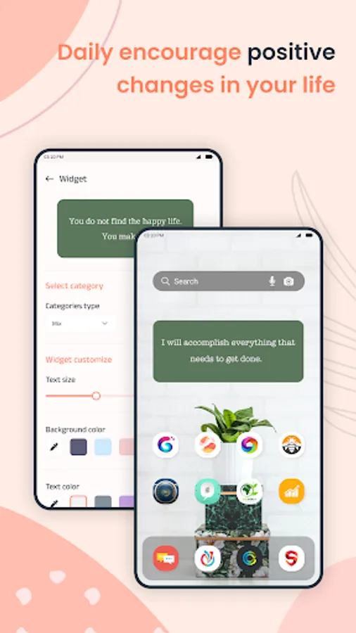 Easy to set the daily reminder by selecting the affirmation quotes category and reminder time. The key feature of the app is that it allows setting the widget on the screen with different customization options like text style, text size, text color, and background color.
