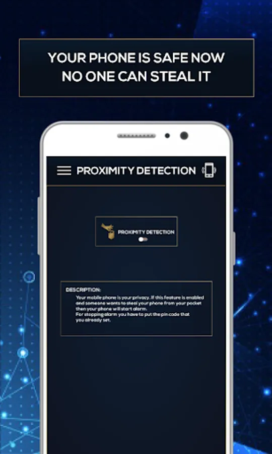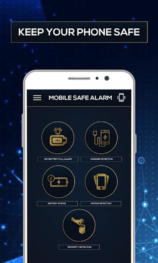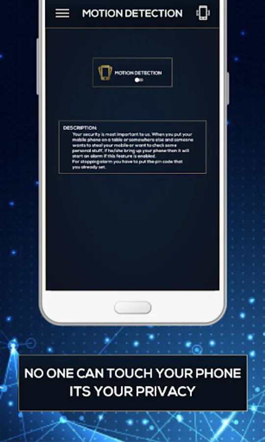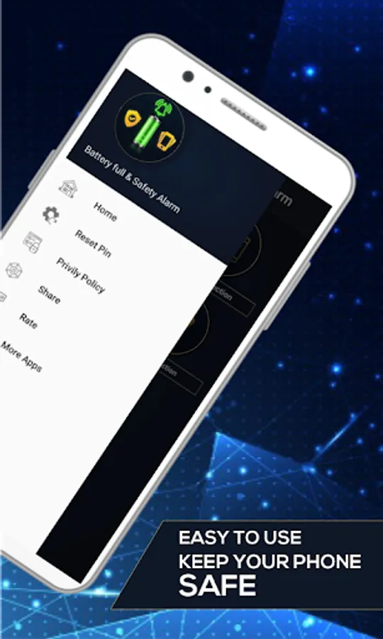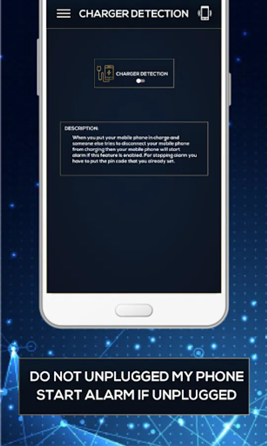 charge fully automatic off this motion deduction wants to steal your mobile or want to check some personal stuff, if he/she bring up your phone then it will start an alarm if this feature is enabled battery full charge alarm battery without charger & charged alarm. motion detector alarm - for stopping alarm you have to put the pin code that you already set.