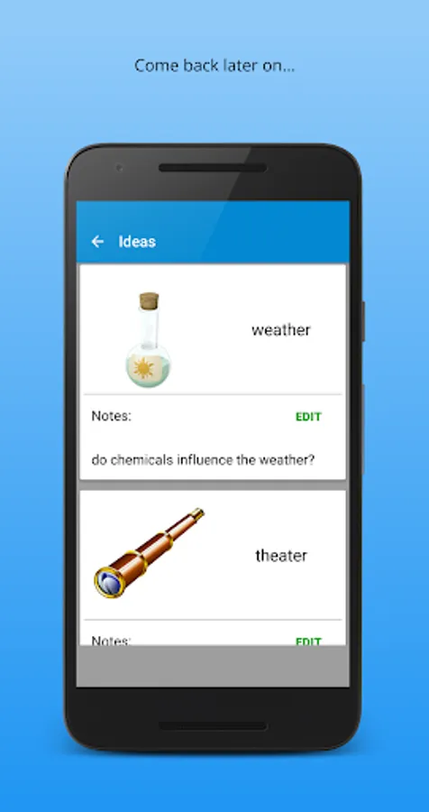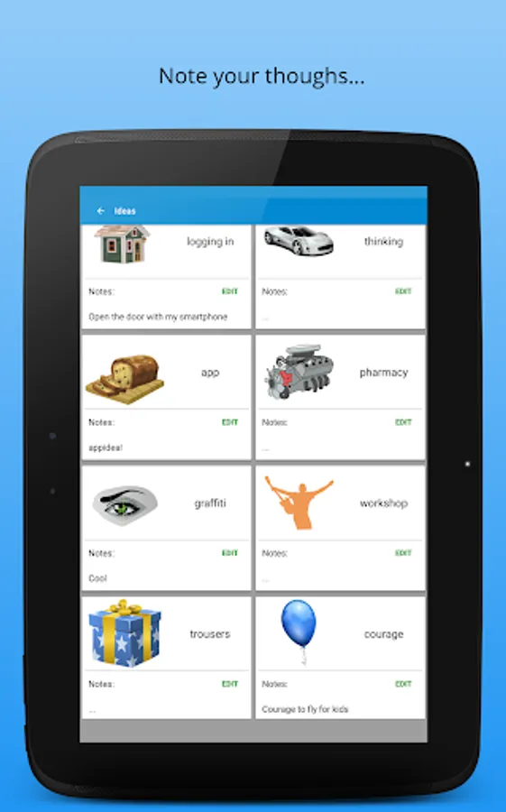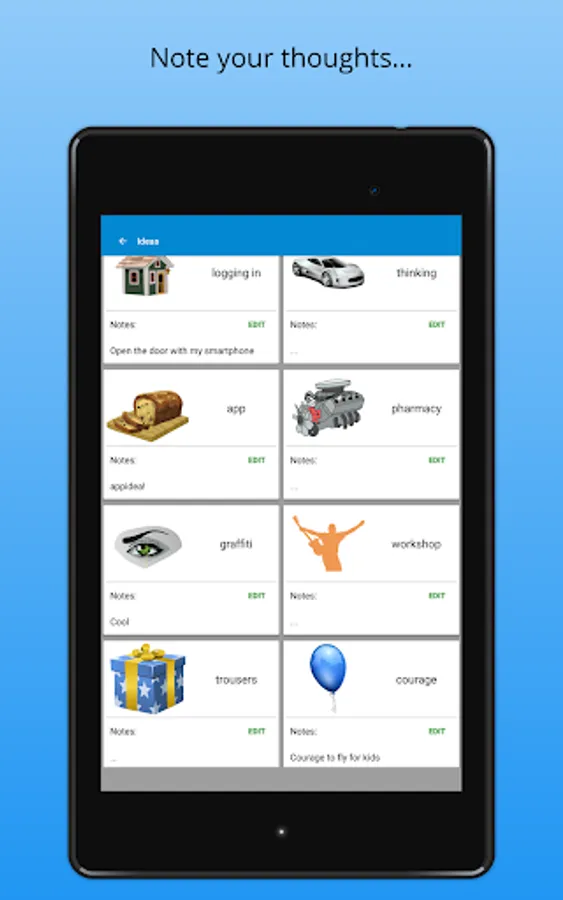 Idea Generator is a free Android app that can help you finding your next new and creative idea. Take some time and let yourself be inspired by the wild cluttered themes. Combine these in mind and think briefly about the potential. Once you have a great idea, you can add a simple note to recall later.